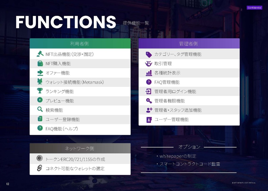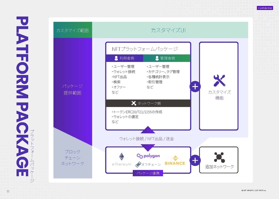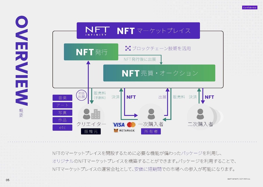 NFT INFINITYとは、独自NFTマーケットプレイス構築のためのプラットフォーム導入・構築サービスです。NFT (web3) の特性を最大限活用した独自の新規事業構想を提案し、ビジネスの設計から技術実現、運営保守管理、追加開発までをトータルでサポートいたします。優れたユーザー体験を伴うUIカスタマイズも柔軟に対応、最適なNFTマーケットプレイス構築を実現します。