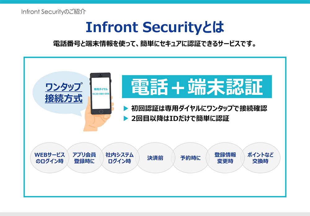 Infront Securityは、電話番号と端末情報を用いた、次世代型のセキュアでスムーズな認証ソリューションです。SMSの届かない・遅延といったトラブルや、パスワード管理の手間を解消し、専用ダイヤルにワンタップ発信するだけで認証が完了します。不正なログインやアカウントの多重作成を防ぎつつ、ユーザーの離脱も最小限に抑え、セキュリティと利便性を両立します。