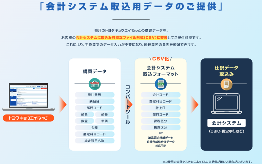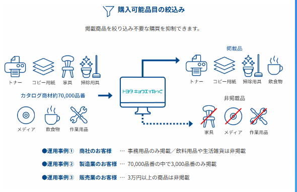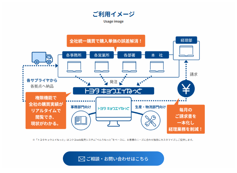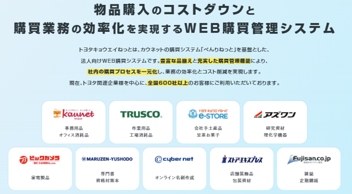 「トヨタキョウエイねっと」は、法人向けに提供されるWEB購買システムです。全社での購買を一元管理し、支払先や購入先の集約、購買プロセスの効率化を通じて、コスト削減・経理業務の負荷軽減を実現します。オフィス用品から工場用資材まで、豊富な品揃えと最短翌日納品で、現場の業務を強力にサポートします。全国600社以上の導入実績があります。