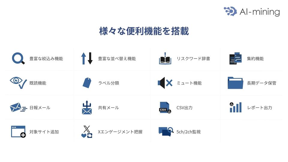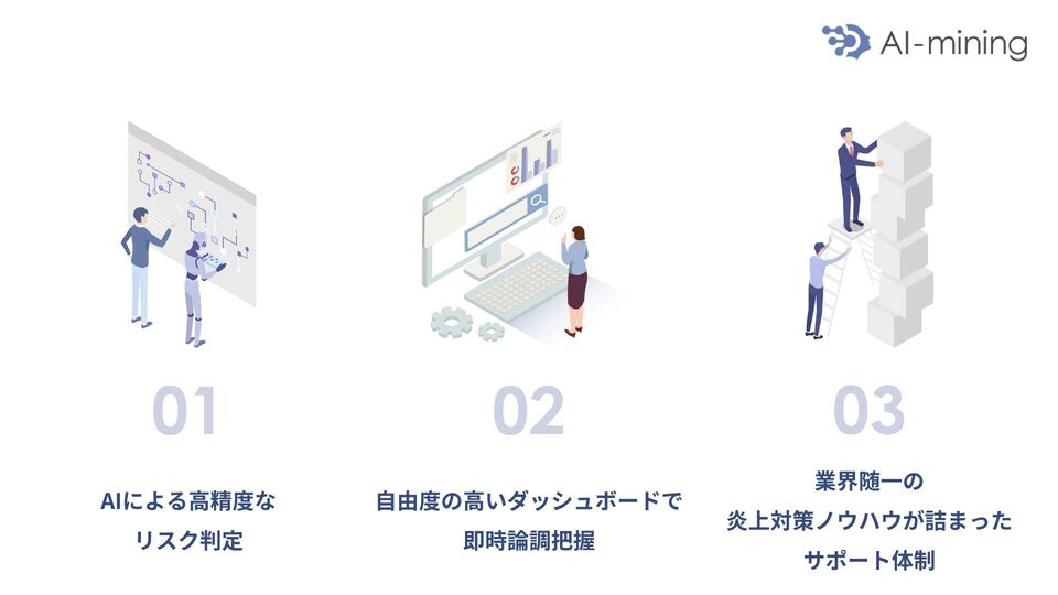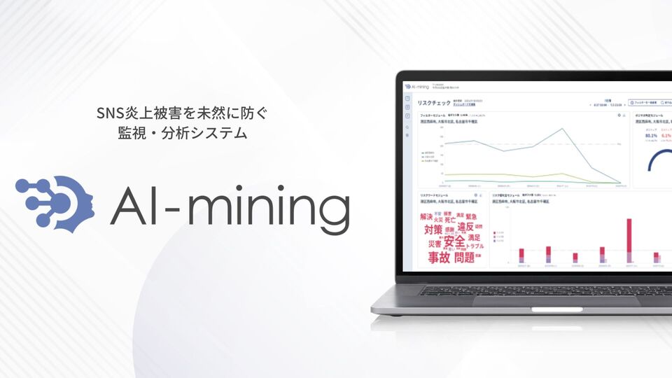 AI-miningは、SNS・掲示板・口コミサイトに潜むネガティブ投稿や誹謗中傷・情報漏洩などをAIを用いた高精度なリスク判定で見つけ出す、AIを活用した次世代モニタリングシステムです。