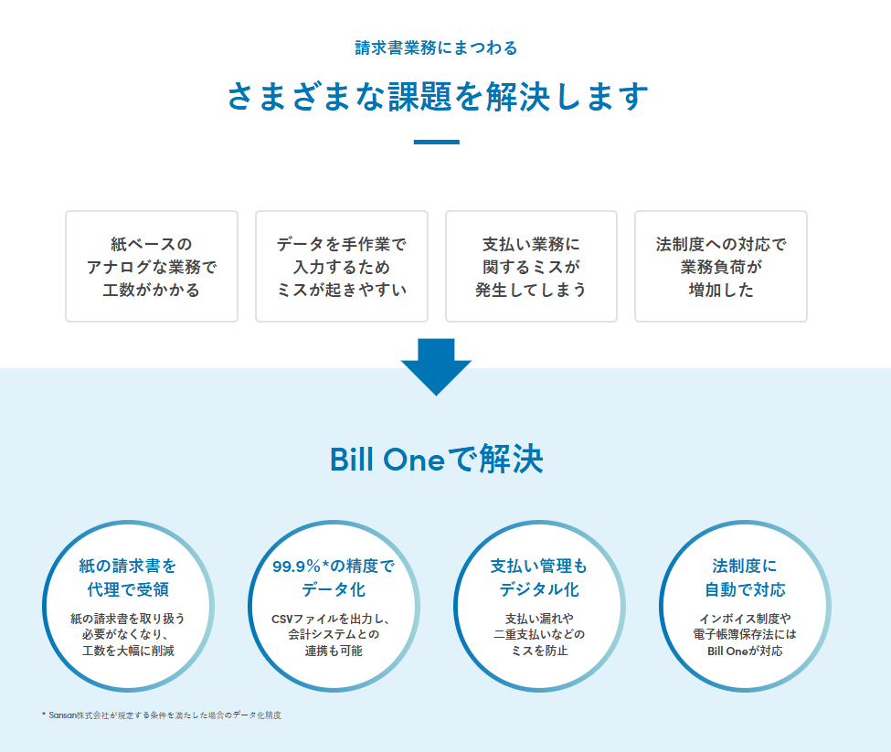 Bill Oneは、Sansan株式会社が提供するクラウド請求書受領サービスです。紙・メール・PDF・アップロードなど、形式や送付方法が異なる請求書をオンラインで一元管理し、99.9%*の精度でデータ化。受領から承認・仕訳・支払通知までをデジタルで完結でき、テレワークや電子帳簿保存法、インボイス制度にも対応しています。