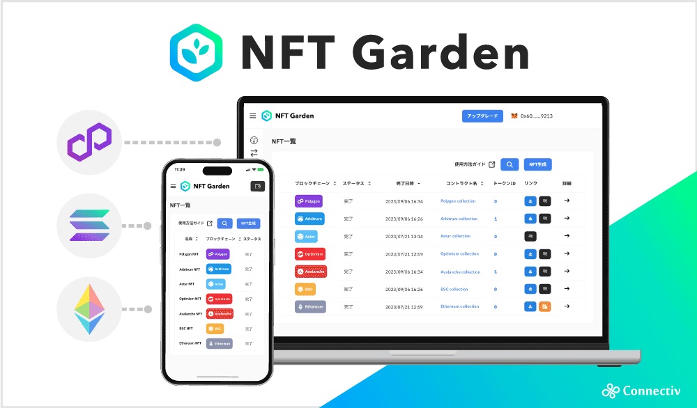 『NFT Garden』はConnectivが開発・運営する企業向けNFT生成・管理プラットフォームです。NFTのスキルや知見、暗号通貨なしで利用できる事や、PolygonやEthereum、Solanaなど、アジア最大級となる19種のブロックチェーンに対応していることが特徴です。外部サービスから利用可能なAPIを実装しており、NFTの生成・転送・参照・管理はもちろんのこと、Web3ウォレットアドレスやSBT(Soulbound Token)などの生成機能も実装しているため、新規Web3事業の立ち上げだけでなく既存サービスへのNFT対応も可能です。