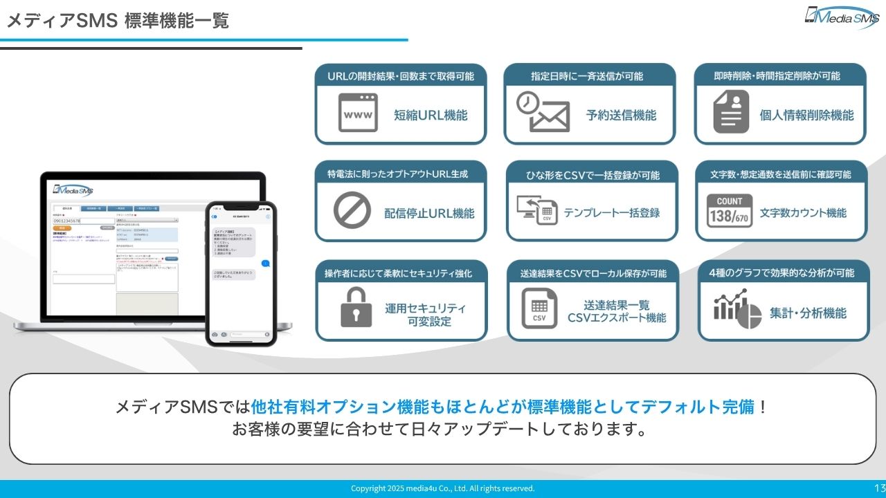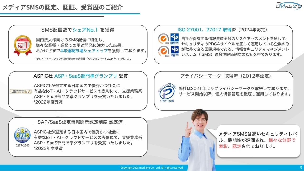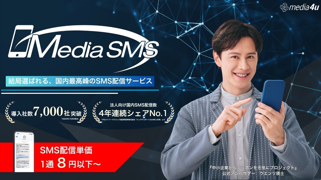 「メディアSMS」は、国内法人向けSMS配信市場で4年連続シェアNo.1(※デロイトトーマツミック経済研究所調査)を誇る、SMS配信に特化したクラウドサービスです。業務連絡、督促、予約リマインド、マーケティングなど、幅広い用途に対応し、導入企業数は6,900社以上。大手企業や金融機関も多数導入しており、高い到達率(99.9%)と正確な送達ステータスが特長です。