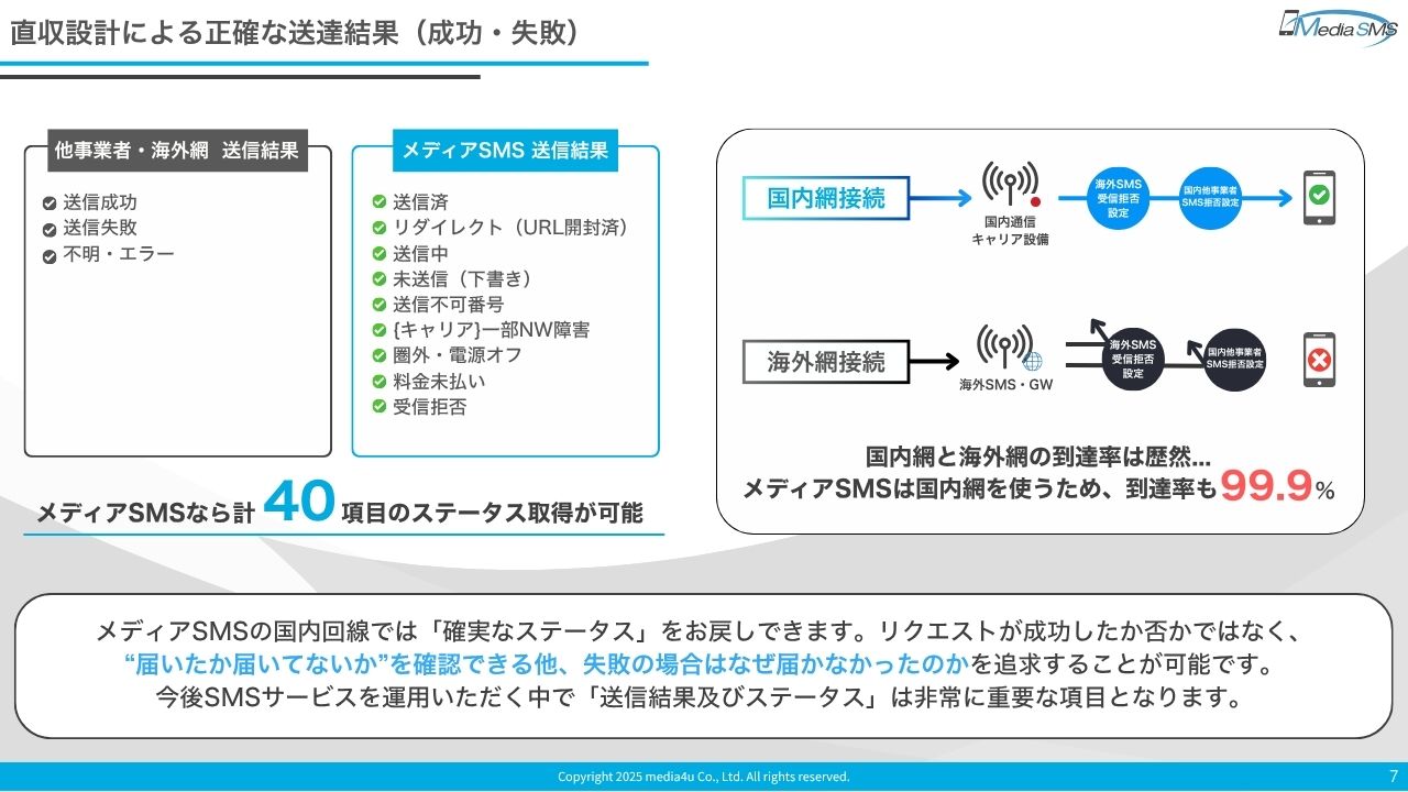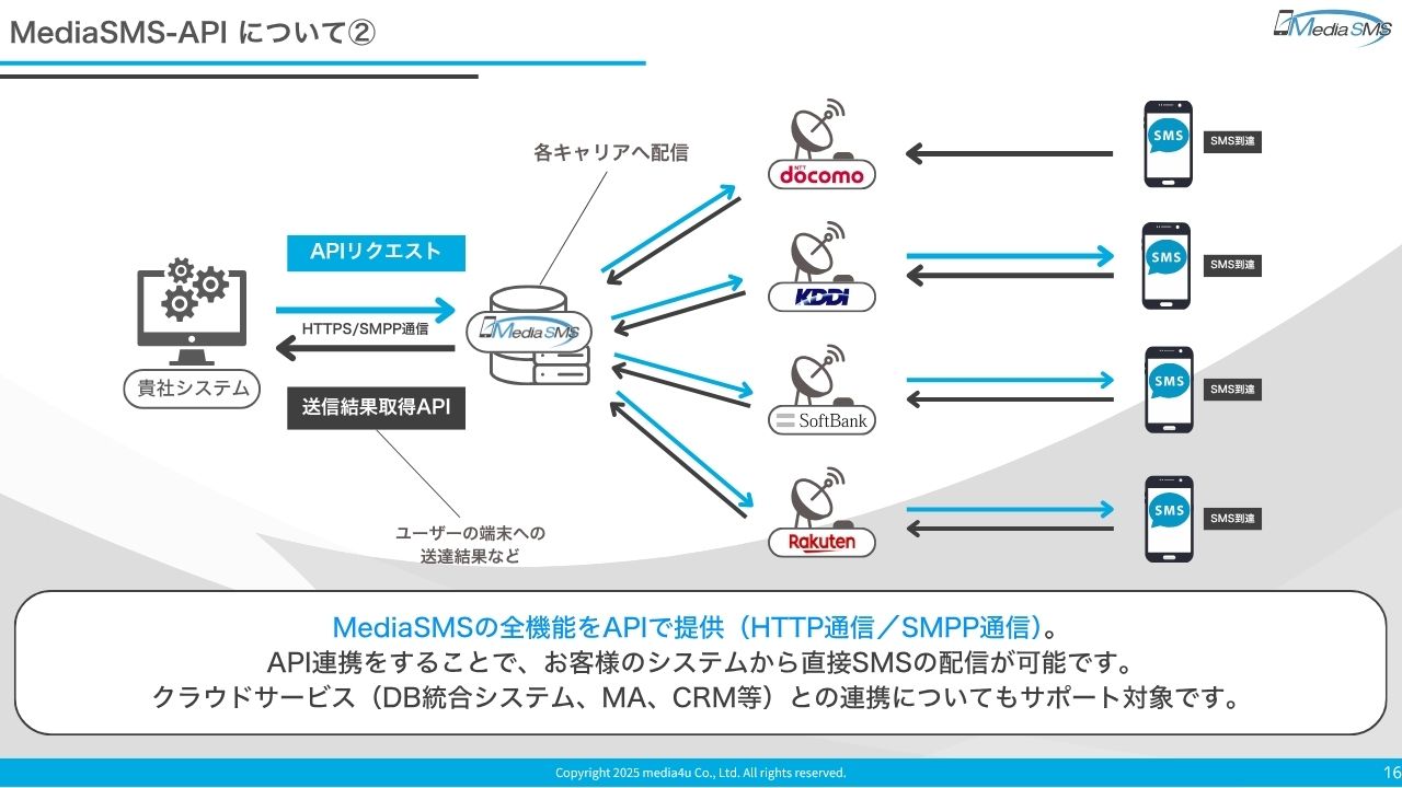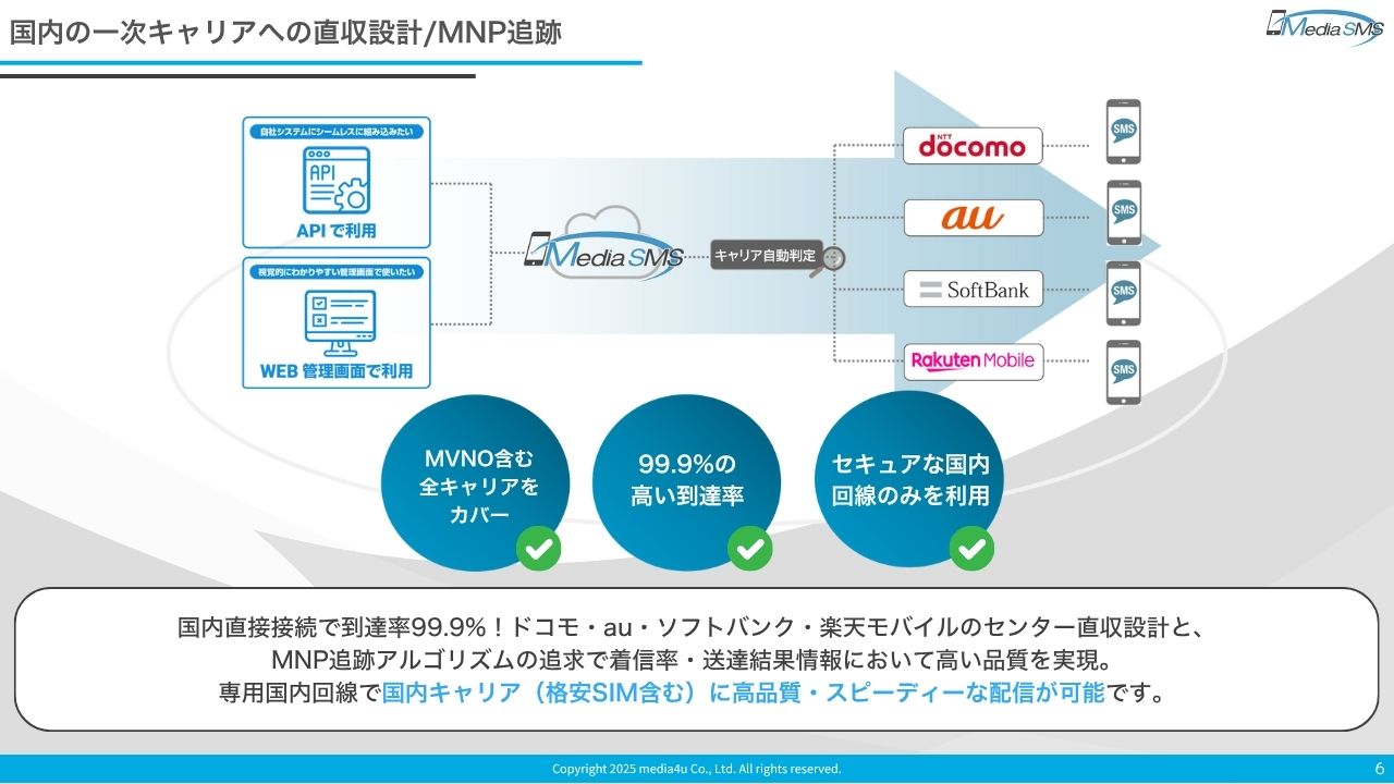 国内4キャリア(docomo、au、SoftBank、楽天)に直接接続し、全MVNOにも対応。正確な配信ステータスをリアルタイムで取得。