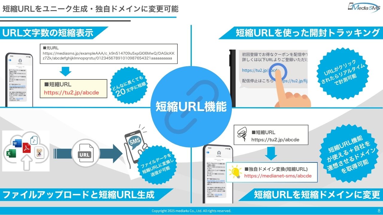 短縮URL生成、テンプレート管理、属性別レポート、アンケート機能など多数。Salesforceやkintoneとの連携実績もあり。