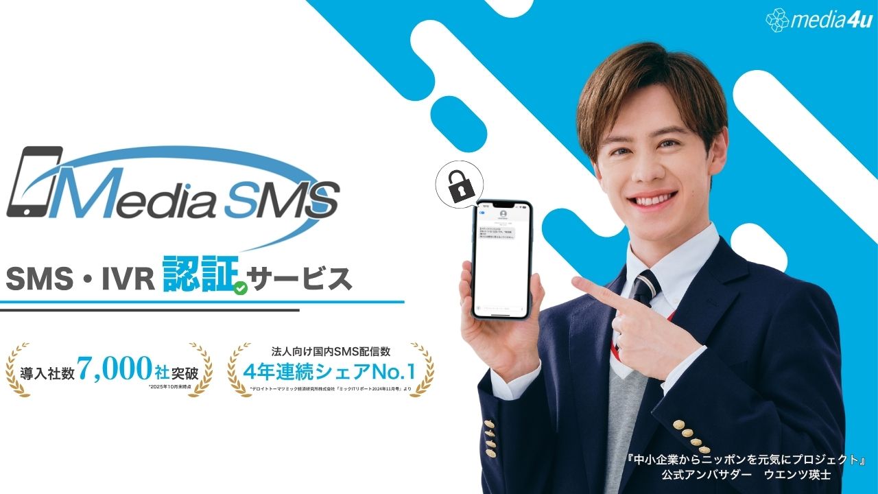 メディアSMSは、本人確認や認証コード送信に特化したSMS認証サービスです。金融機関や官公庁を含む6,900社以上に導入されており、SMS配信市場で4年連続シェアNo.1(到達率99.9%)の実績を誇ります。専用認証サーバーや音声SIM判定オプション、IVR認証対応により、セキュリティ性と利便性を兼ね備えた本人認証環境を構築できます。
