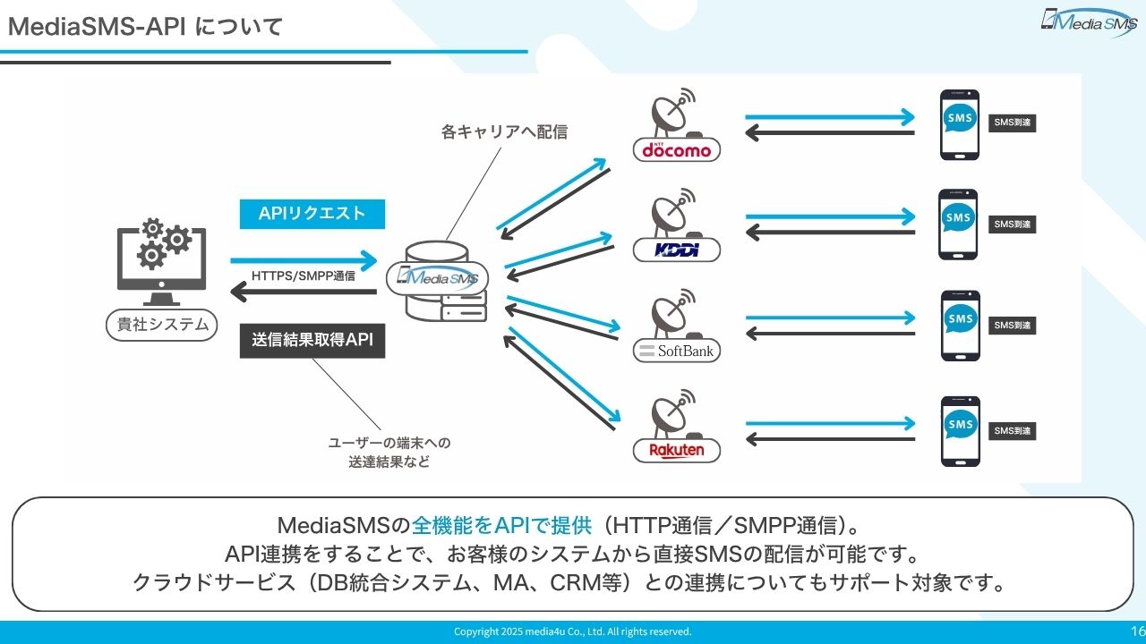 ドコモ・au・ソフトバンク・楽天モバイルとの直接接続により、信頼性の高いSMS配信と正確なステータス取得を提供