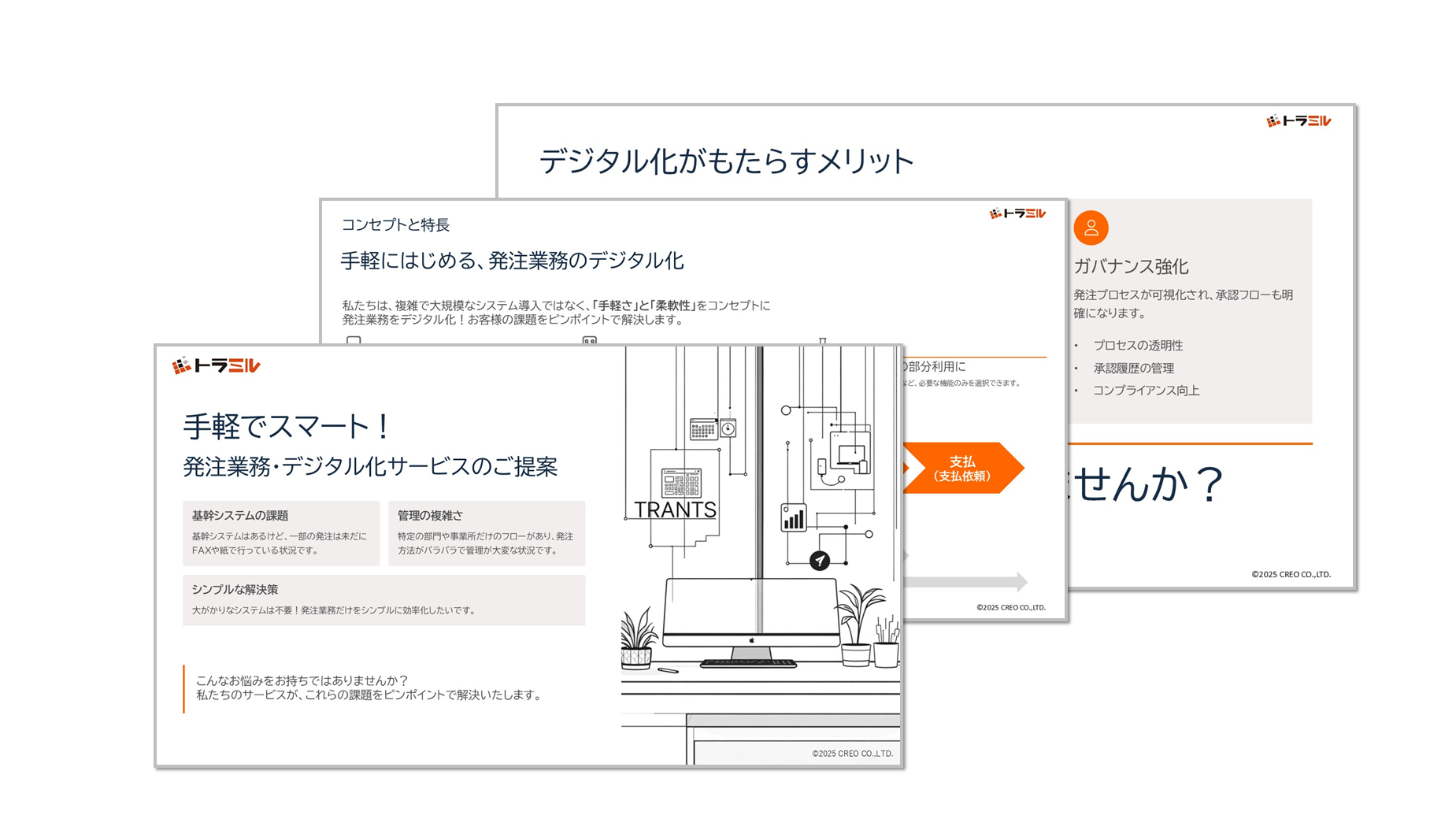 トラミルは、備品や消耗品、外注作業費などの発注・購買業務をデジタル化する、スモールスタートに最適なクラウド型購買管理システムです。複雑で大掛かりな基幹システムでは対応しきれない部門単位の発注業務を対象に、「発注だけ効率化したい」「紙やFAX運用から脱却したい」といったニーズにピンポイントで応えます。