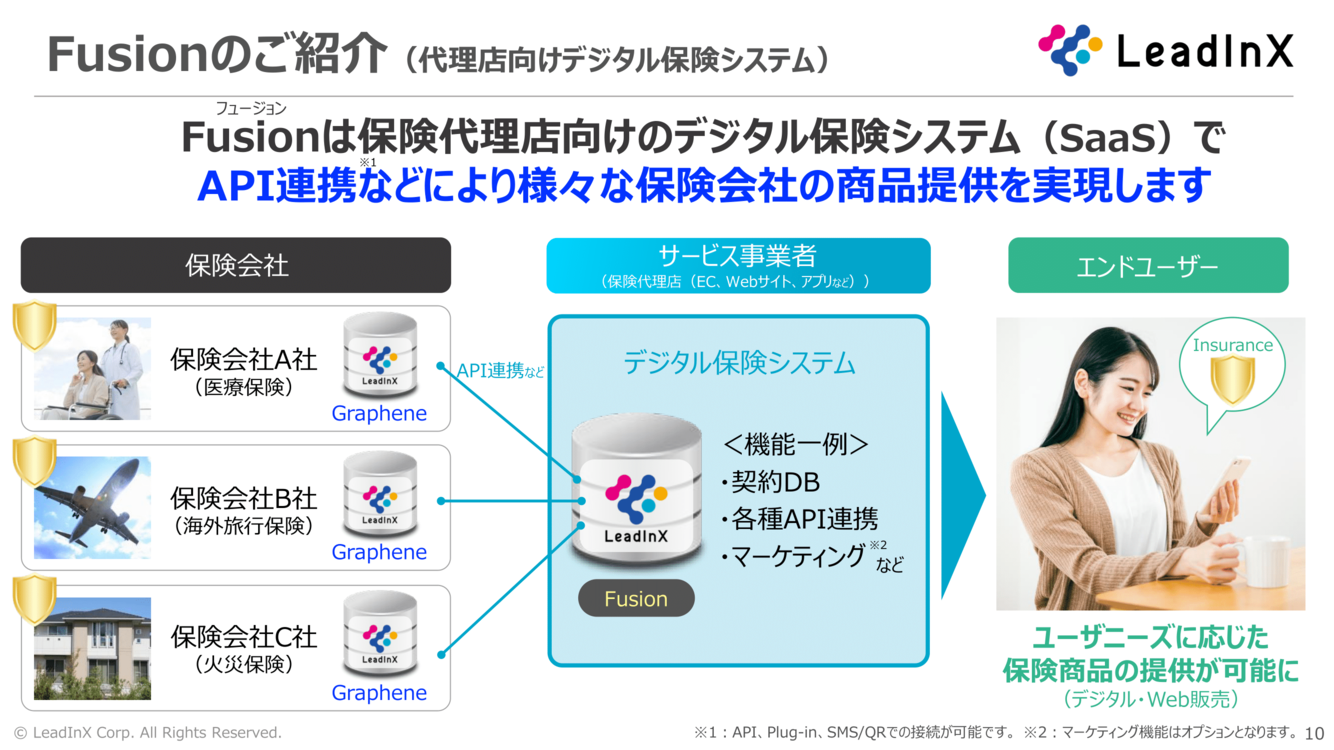 Fusionは、リードインクス株式会社が提供する保険代理店向けのデジタル保険プラットフォーム(SaaS)です 。AI時代に対応するミドルウェアプラットフォームとAPI連携を通じて、さまざまな保険会社の商品を自社アプリやWebサイト内で提供可能で、柔軟で拡張性の高いデジタル保険事業の立ち上げを実現します 。