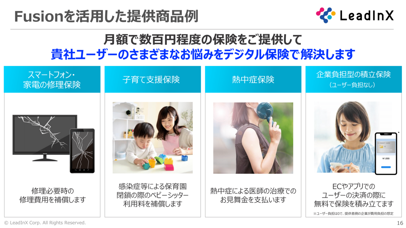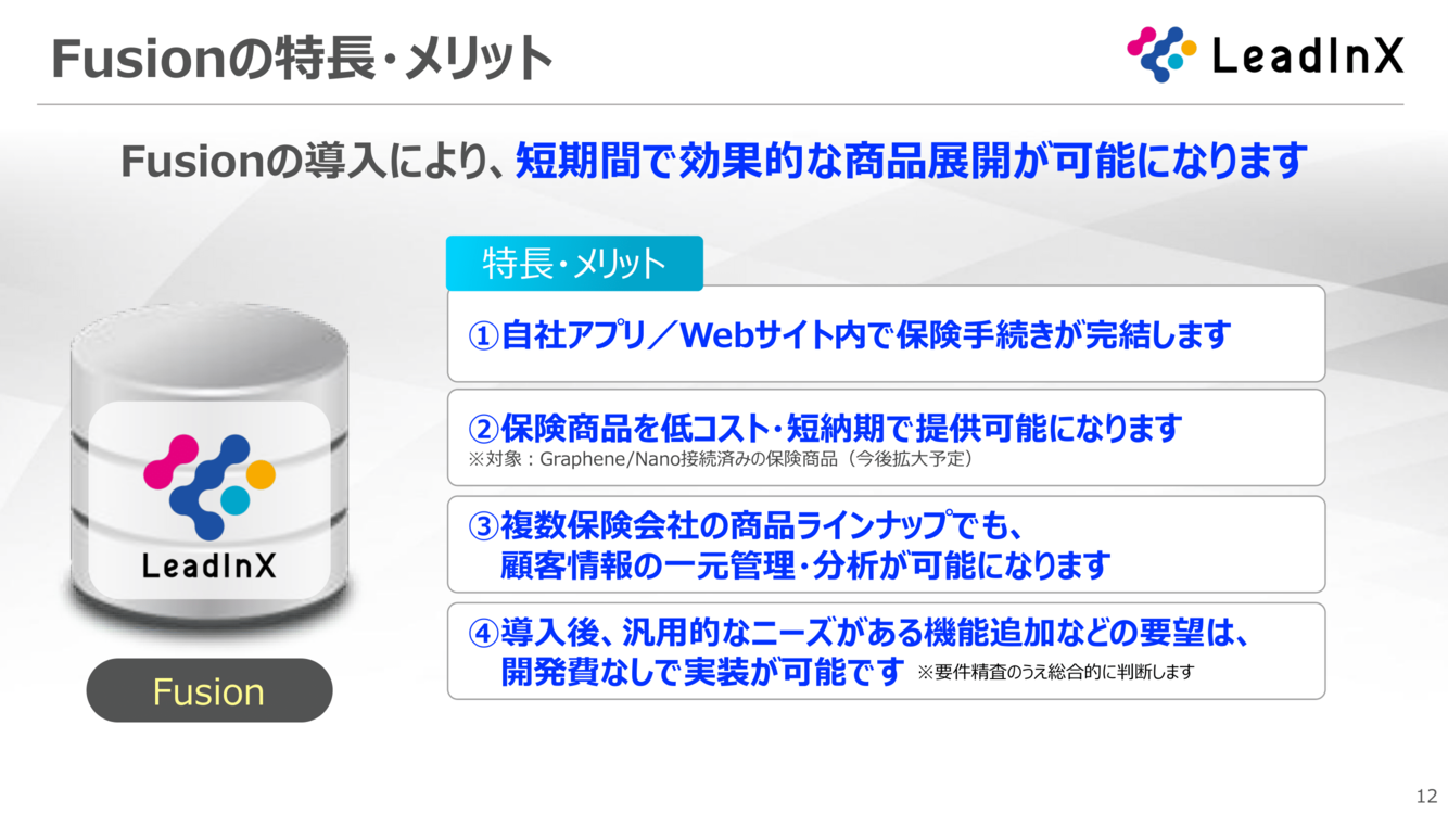 ・保険会社向けデジタル保険プラットフォーム(Graphene・Nano)に接続済みの保険商品を、低コスト・短納期で導入可能