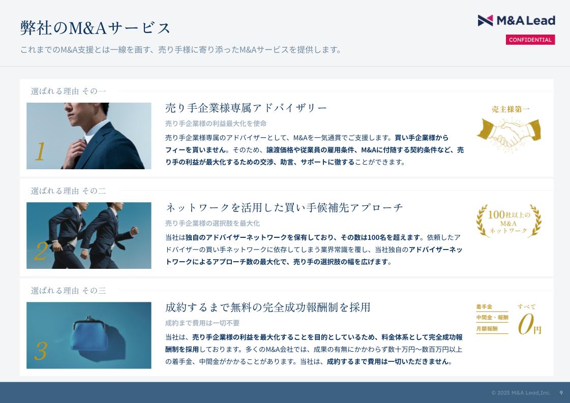 ・中小企業庁の「M&A支援機関登録制度」に登録しており、ガイドラインを遵守した透明性の高い支援を提供