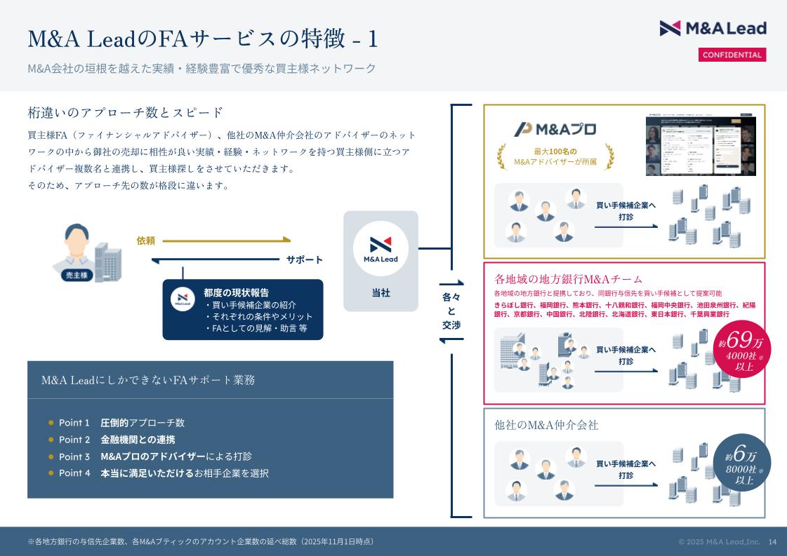 ・100名を超える独自のアドバイザーネットワークを活用し、他社仲介会社や地方銀行とも連携した圧倒的なアプローチ数を実現