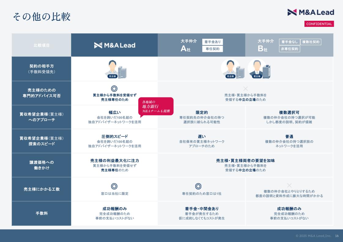 M&A Leadは、M&A仲介会社とは異なり、売主様(譲渡企業)側のみの利益を追求する「譲渡企業専属」のM&Aアドバイザリー企業です 。買い手企業から手数料を受け取らない「セルサイド(売主様)専任」の立場を徹底することで、譲渡価格の最大化や従業員の雇用継続など、売主にとって最も有利な条件での成約を支援します。