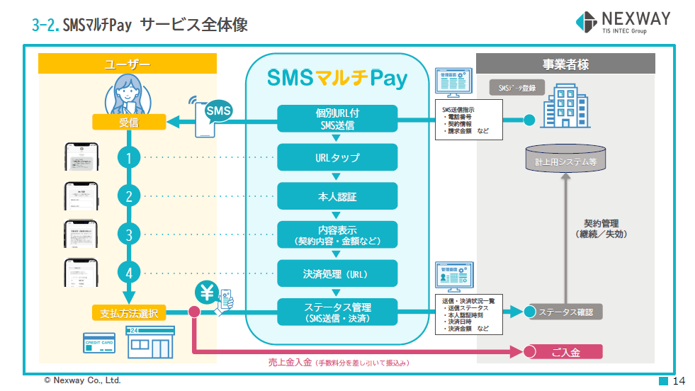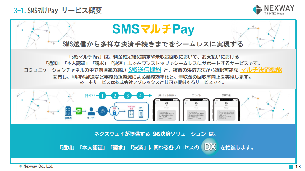 SMSマルチPayは、株式会社ネクスウェイが株式会社アグレックスと共同で提供する、請求・回収業務のDX推進サービスです 。到達率の高いSMS送信機能と、複数の決済方法を選択可能なマルチ決済機能をワンストップで提供し、通知から本人認証、請求、決済までをシームレスにサポートします 。