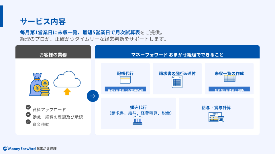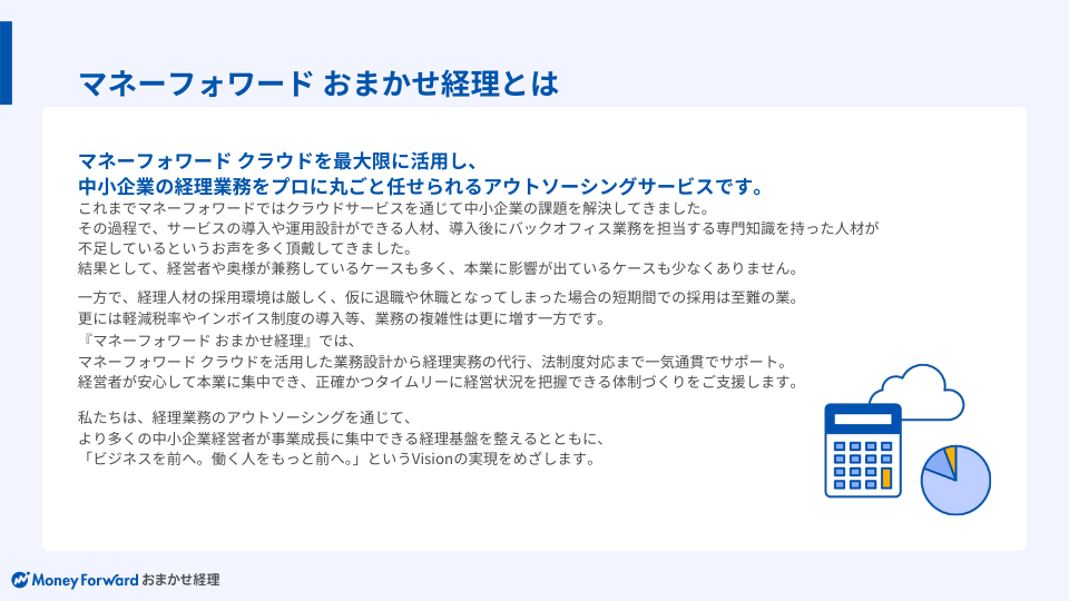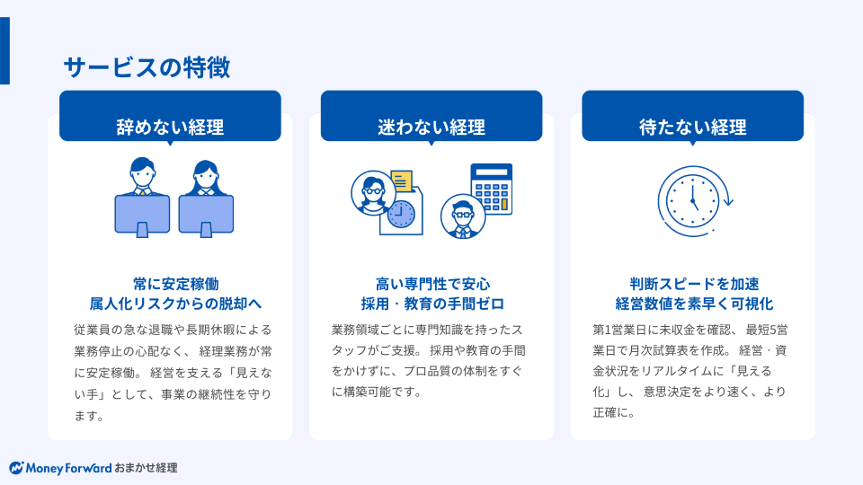 マネーフォワード おまかせ経理とは、マネーフォワード クラウドを最大限に活用し、中小企業の経理業務をオンラインでプロに丸ごと任せられる経理アウトソーシングです。経理業務全般に幅広く対応可能で、経理業務を丸ごと任せられます。マネーフォワード クラウドを活用した業務設計から経理実務の代行、法制度対応まで一気通貫でサポート。経営者が安心して本業に集中し、正確かつタイムリーに経営状況を把握できる体制づくりを支援します。