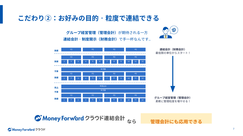 決算体制やグループ組織に変化が生じても、柔軟に対応が可能。制度連結への対応はもちろん、予実管理・管理会計目的での利用実績も豊富です。