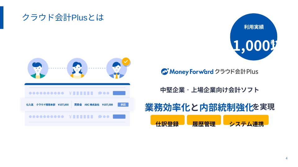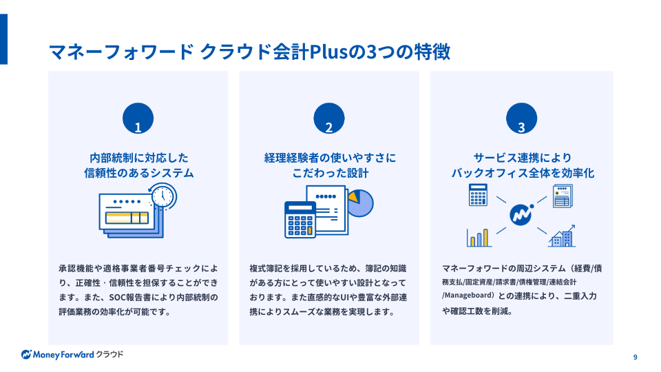 マネーフォワードクラウド会計Plusはデータの自動取得、自動仕訳、自動学習の3つの自動化で経理業務が効率化できる会計ソフトです。仕訳承認フローや業務分担にあわせた詳細な権限設定が可能で、内部統制を強化したい企業におすすめです。