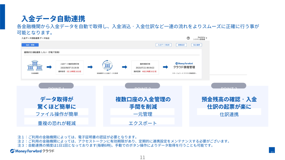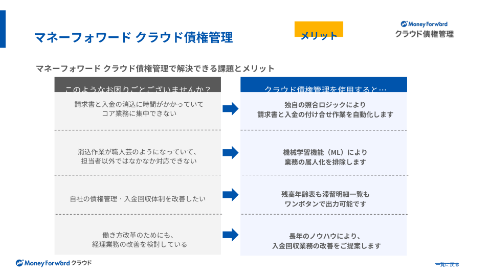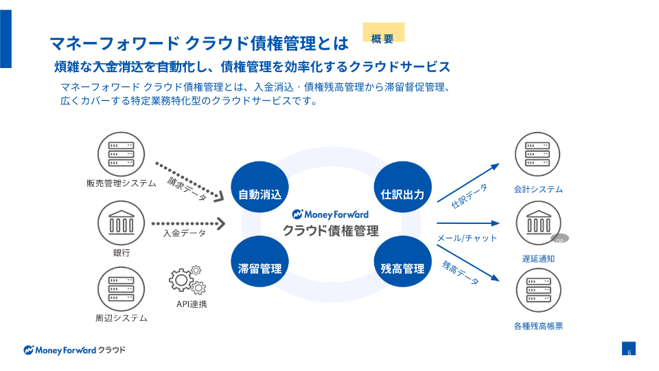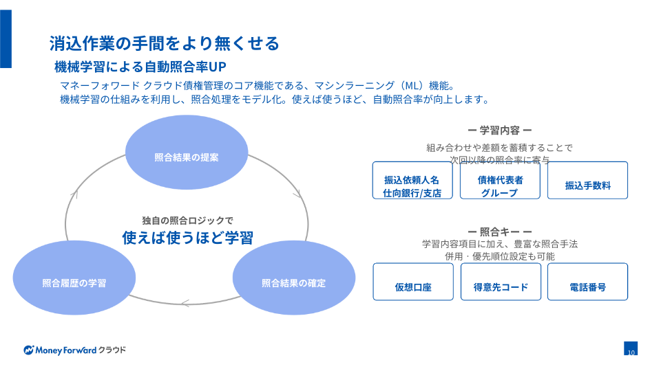 マネーフォワード クラウド債権管理は消込・債権残高管理から滞留督促管理まで、 広くカバーする特定業務特化型のクラウドサービスです。すでに別システムで運用されている場合、消込部分のみでのご利用ももちろん可能です。複数の金融機関の入金データを自動で取得し、マシンラーニング(ML)機能により照合処理をモデル化。使えば使うほど、自動照合率が向上します。