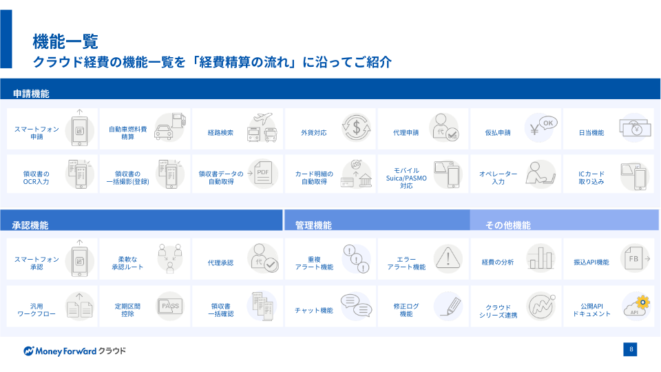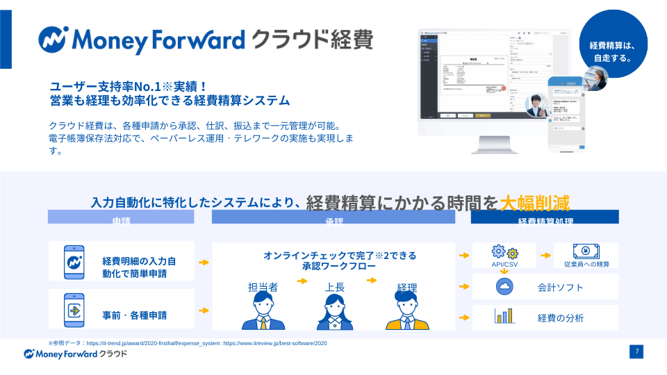 マネーフォワード クラウド経費を利用すると、申請者も承認者も経費精算処理の時間が削減でき、ペーパーレスでテレワークも可能に。経理業務はチェック業務や仕訳連携・振込業務の効率化が実現でき、一連の流れがリモートで運用できます。