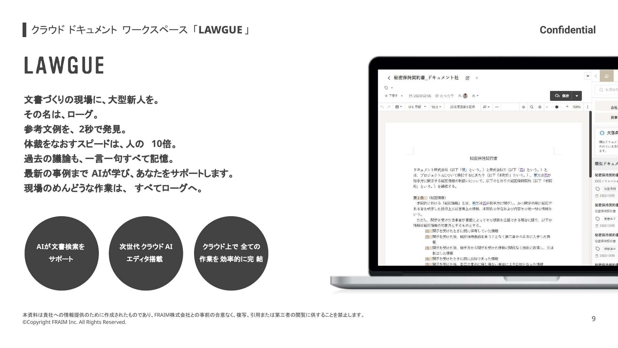 LAWGUEはAI技術と独自のエディタを活用し、契約書・規程・開示文書の作成やレビュー、
