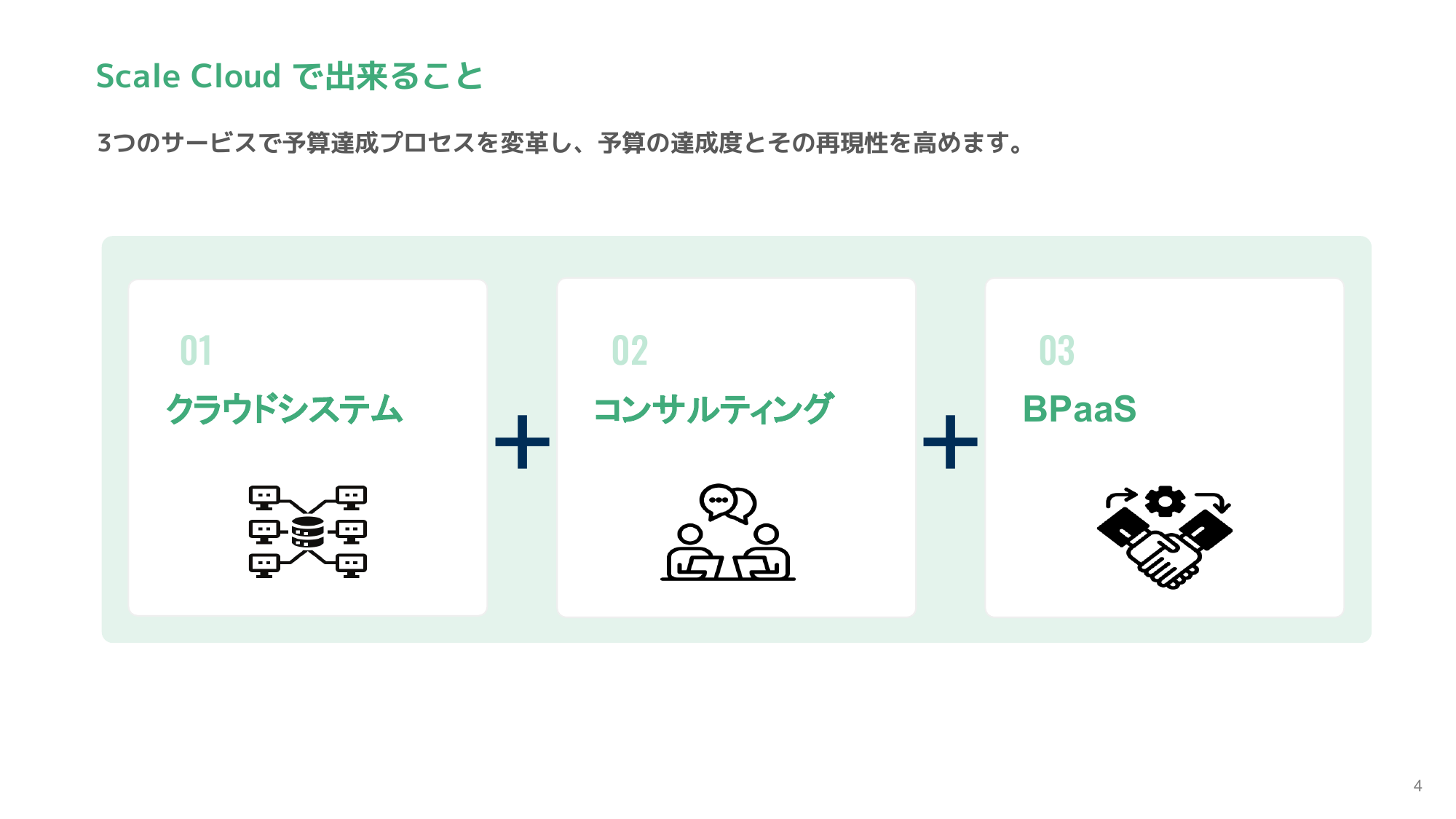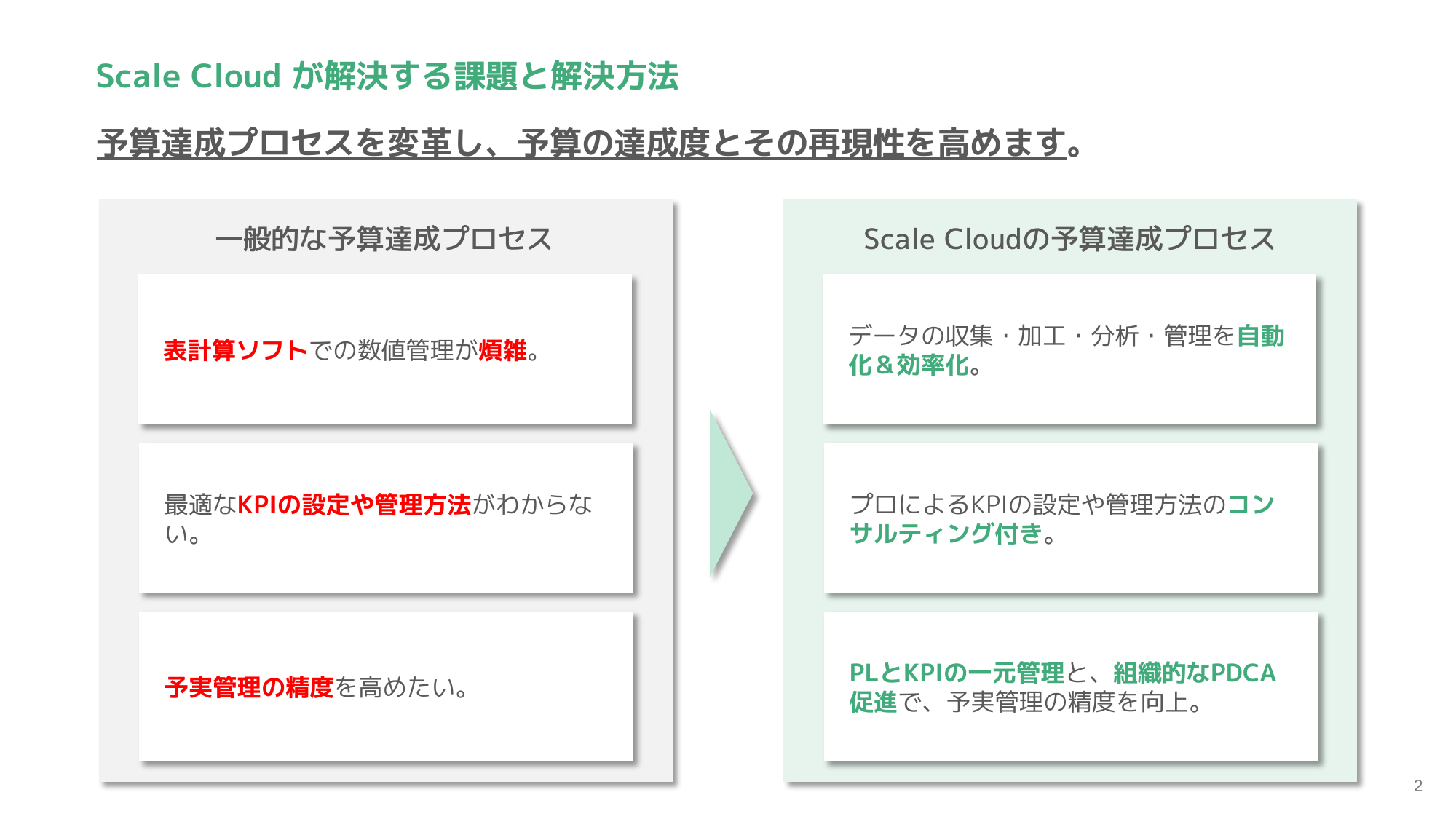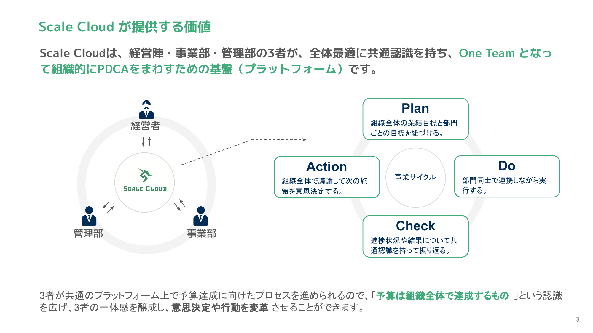 Scale Cloudは、財務数値(PL/BS/CF)と非財務数値(KPI)を関連づけて一元管理することで、予算の達成度とその再現性を高める経営管理システムです。