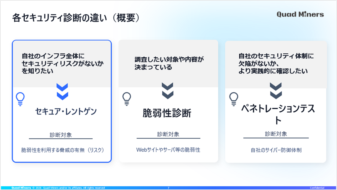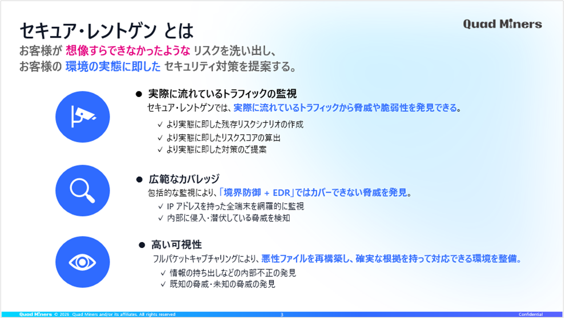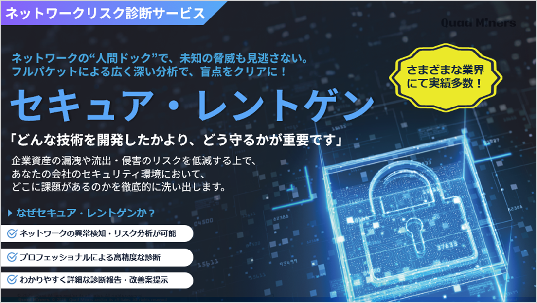 セキュア・レントゲンは、株式会社クワッドマイナージャパンが提供するネットワークリスク診断サービスです。NDR製品「Network Blackbox」のフルパケットキャプチャ技術を活用し、実際に流れているトラフィックからネットワーク上の脅威・脆弱性を洗い出します。脆弱性診断やペネトレーションテストとは異なり、ネットワーク全体を網羅的に監視して「想像すらできなかったリスク」を可視化し、実態に即したセキュリティ対策を提案します。