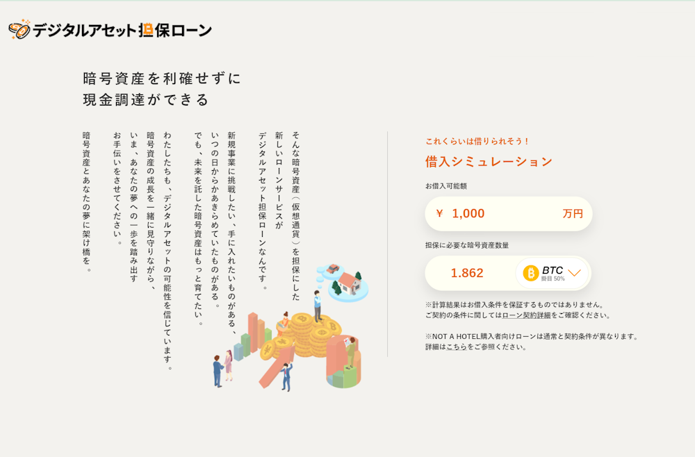 暗号資産を活用した「デジタルアセット担保ローン」はビットコイン、イーサリアムを担保資産として現在取り扱い中。