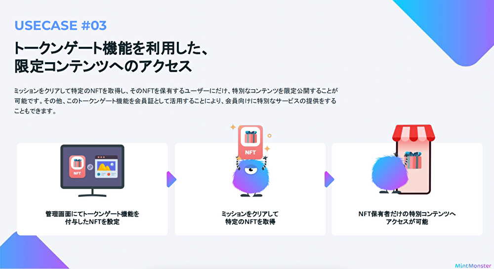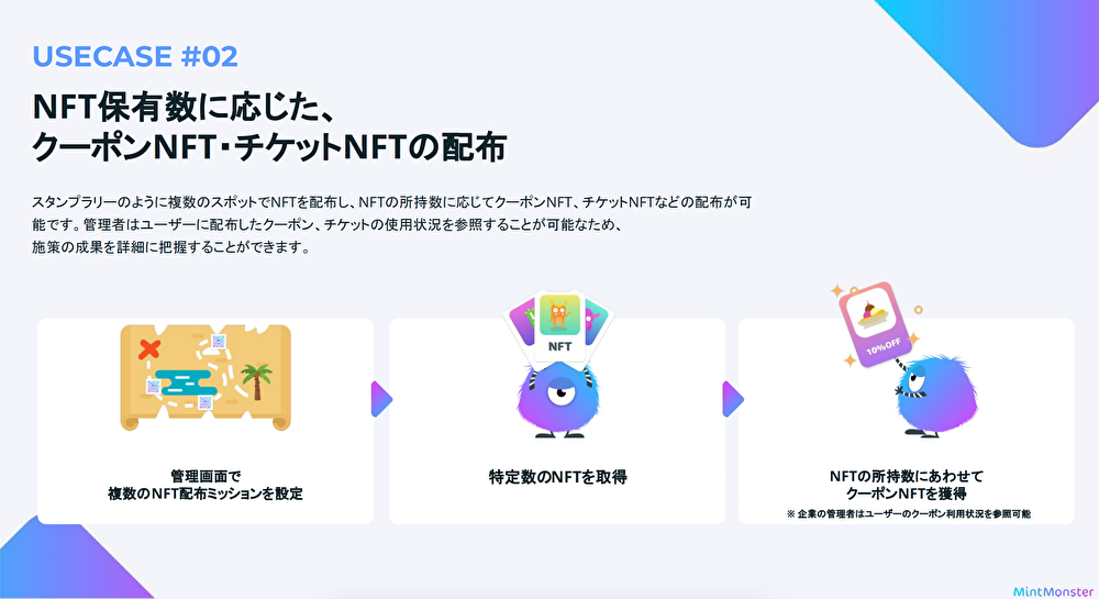 MintMonsterは企業によるNFTのビジネス活用を、簡単かつ迅速に実現するプラットフォームです。これまでのNFTの配布や受取における手間・難しさなどの課題を解決し、「誰でも親しめる、身近さと楽しさ」を実現しました。また、企業がNFTの活用で成果を出せるよう、ユーザーとのタッチポイントを増やし、エンゲージメントを向上させるための機能も搭載しています。
