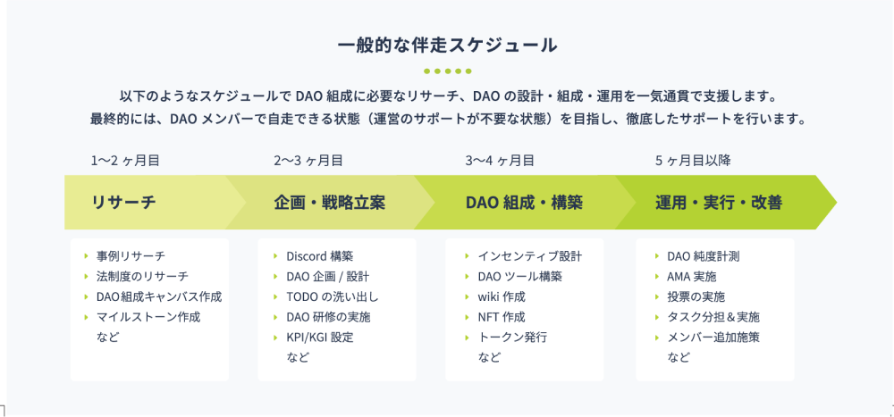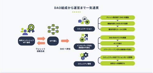 DAOX(ダオエックス)では、大手企業へのDAO組成支援の経験から既存事業のDAO化やDAOによる事業検証をサポート。スムーズなDAO立ち上げとメンバーの巻き込み、自律的に推進されていくコミュニティ作りを実現します。