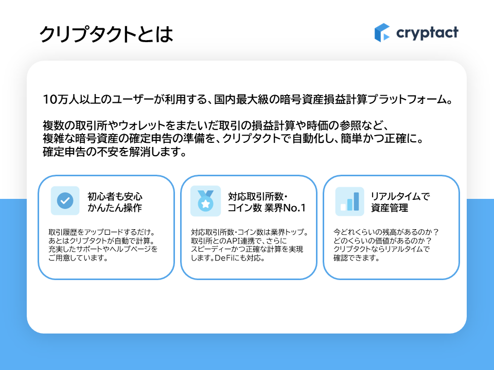 クリプタクトは暗号資産(仮想通貨)の自動損益計算サービスです。