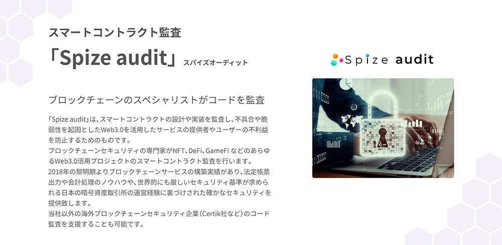 「Spize audit」は、スマートコントラクトの設計や実装を監査し、不具合や脆弱性を起因としたWeb3.0を活用したサービスの提供者やユーザーの不利益を防止するためのものです。ブロックチェーンセキュリティの専門家がNFT、DeFi、GameFi などのあらゆるWeb3.0活用プロジェクトのスマートコントラクト監査を行います。