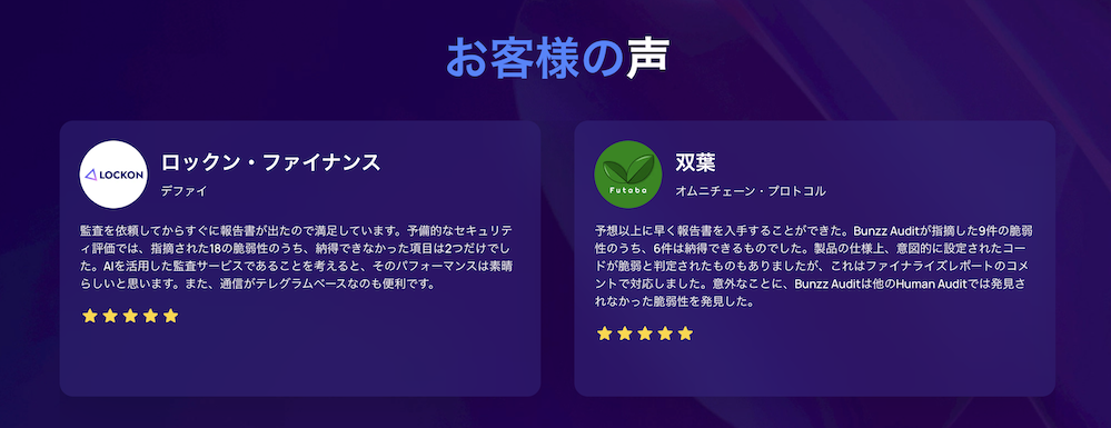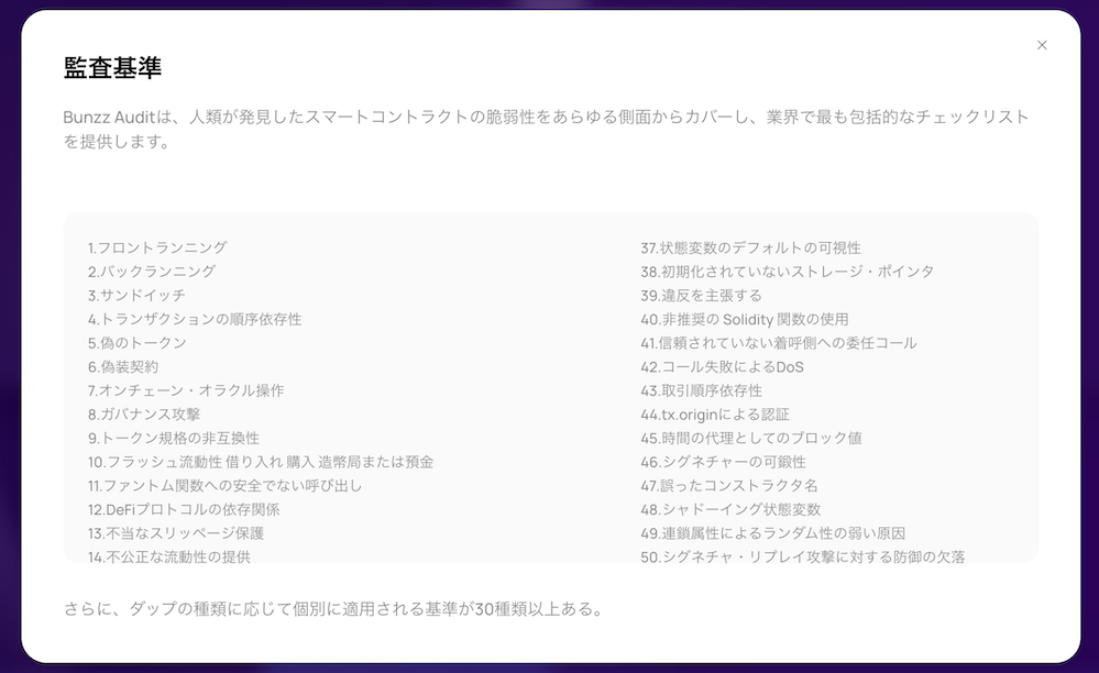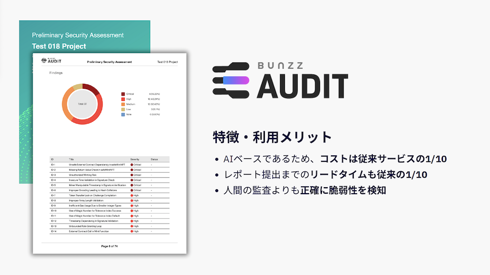 ブロックチェーン関連プロジェクトの開発に必須な「スマートコントラクト」のセキュリティ監査サービスです。監査工程の一部がAIベースの処理になっており、人間のマニュアル監査よりも包括的でコストパフォーマンスに優れたサービスとなっています。無料相談も受け付けておりますのでお気軽ご相談ください。